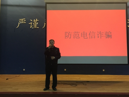 讲座开始,马警官以幽默的方式引入话题,通过视频向学生讲述交通安全隐患无处不在,以天津某些高校现实生活中的例子,警示了交通安全的重要性。陈警官以案说法,列举了几种常见的电信诈骗形式。陈警官与现场同学互动,组织学生模拟了现实情况,效果良好,并告知派出所的座机电话,方便同学们有紧急情况,随时联系。罗冠男老师主要向大家介绍了恐怖主义的危害以及高校大学生避免恐怖主义的方法,最后还向在场的每一位师生倡议:安全校园,防恐有责,人人学法,时时反恐。