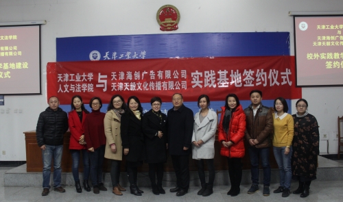 2016年11月25日,我校与天津海创广告有限公司、天津天毅文化传播有限公司实践基地建设签约仪式在文法学院举行。文法学院院长范国华、副院长尚绪芝、党委副书记艾军、天津海创广告有限公司总经理王宏伟女士、天津天毅文化传播有限公司副总经理张妍女士出席仪式,文法学院广告学专业师生110余人参加了活动。