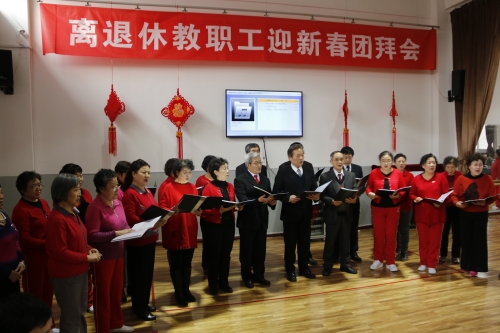 团拜会上,离退休教职工欢聚一堂,畅叙友情,气氛愉悦,其乐融融。离退休教职工合唱团、舞蹈队、京剧社团还精心准备了大合唱、小合唱、舞蹈、戏曲等文艺节目,各具特色的表演赢得了阵阵掌声,唱出了老同志们的开心,舞出了老同志们的幸福。