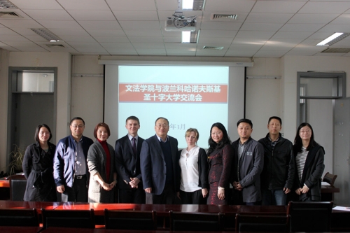 2017年3月29日下午,在我校国际交流处副处长张兴国的引荐下,波兰圣十字科哈诺夫斯基大学学生交流办公室及欧盟Erasmus+奖学金项目负责人Justyna Palacz女士、该校人文学院法学系Krzysztof Sielski副教授与我校文法学院就学生及教师国际交流事项进行了深入交流。文法学院领导班子成员与法学、传媒艺术系主任参加了此次交流活动。法学系宋佳宁老师担任此次活动的翻译工作。