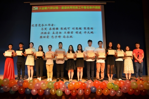 国际歌奏毕,表彰大会正式开始。张华书记代表学院党委对受到表扬的优秀支部、共产党员、党务工作者表示热烈祝贺。同时,对即将毕业的同学们致以温馨的寄语,希望广大党员增强光荣感和责任感、保持先进性内在动力,充分发挥先锋模范作用。随后,朱士凤副书记宣读了优秀集体和个人表彰决定,获得表彰的优秀党员、党务工作者、支部代表依次上台领奖,大会进入高潮。最后,洪振家作为优秀党员代表上台发言,对四年以来支持党建工作的老师们、同志们表示崇高的敬意和衷心的感谢,并希望即将离开校园的党员们在未来的日子里继续发光发热、为祖国建设又快又好的发展不懈奋斗。