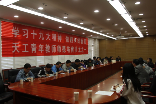 为深入学习十九大精神,进一步落实全国高校思想政治工作会议精神,落实好学校青年教师师德培育计划,2017年10月23日下午,天津工业大学“学习十九大精神,做‘四有’好教师”青年教师沙龙举行。各学院青年教师代表和教师发展中心、宣传部、校工会负责人一起座谈。