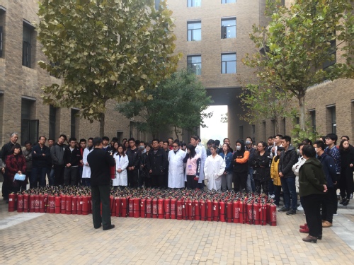 接着,消防疏散演练正式开始。校保卫处张志勇处长亲临现场指挥,当消防警报拉响后,学院楼内全体师生按照疏散路线进行撤离,90名教师、306名研究生、236名本科生成功撤离到学院楼后空地的指定位置,整个过程迅速、有序。随后,师生仔细听取了灭火器的使用原理、基本操作方法及注意事项。认真聆听及观摩操作后,与会师生均亲自体验了现场灭火的全过程,按照灭火的步骤和方法将火堆燃起的大火迅速扑灭。