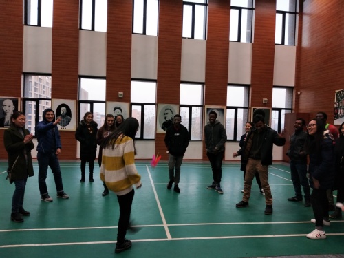 王津副院长在讲话中希望同学们开心地参加此次中国传统游艺活动,用心地学习汉语、了解中国传统文化、结交中国朋友,努力让自己成为中国通。为了突出本次活动的主题,主持人为留学生详细介绍了踢毽子、跳长绳、滚铁环等中国传统游艺活动的起源与发展,紧接着由中国学生进行现场示范。留学生们惊叹于踢毽子的巧妙技术、跳绳的花样变化、滚铁环的平衡技巧以及筷子夹乒乓球的协调能力。留学生纷纷跃跃欲试。“踢毽子”、“滚铁环”这些中国人记忆中的传统游戏,外国留学生们也玩得有模有样,精彩角逐与欢声笑语交织成趣。