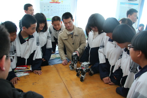 此次活动由人文与法学院研究生强怡明主持,共分为四部分,分别为:“青马学子领读团”成员夏平、沙瑞开展学习宣传贯彻党的十九大精神领读活动;机械学院大二学生李志文、辛万钊进行“机器人展示及原理介绍”;艺术与服装学院朱旭光老师为学生带来了职业生涯规划趣味体验课;我校学工部师生代表与蓟州区尤古庄镇初级中学师生代表亲切座谈,罗艳老师代表学工部向该校品学兼优、家庭经济困难的两名同学捐赠了书包和御寒衣物,并向学校捐赠了篮球、跳绳、笔盒等学习用品和文体用品,金银辉同学代表“青马工程”培训班学员与这两名同学建立“大手拉小手青春共成长”结对帮扶,拟定期为其开展思想引导和学业指导,帮助乡村学校学生健康成长和顺利成才。