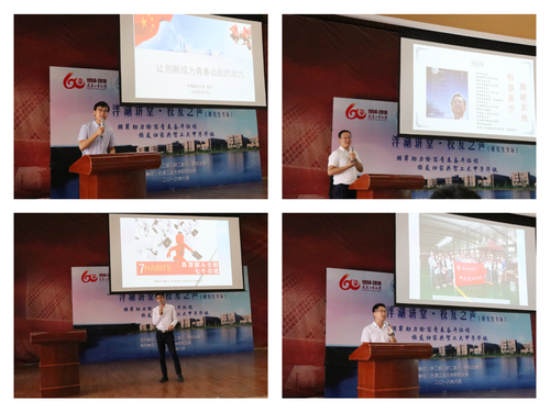 一段充满温情激昂的短片拉开了活动的序幕。首先分享的是曾任天津工业大学第17届研究会主席的黄丹,现已被天津市教育招生考试院录用。黄丹学长带来了“你所做的一切,终将造就未来的自己”主题分享。他从明确志向、刻苦学习和公务员招考经验三个部分向大家分享了他的研途求学感悟。第二位分享的校友是曾任天津工业大学第16届研究生会主席、环境与化学工程学院分研会主席的程文才,现就职于上海震坤行贸易有限公司。程文才学长为大家分享的是“高效能人士的七个习惯”,通过解读了梦想二字的意义,勉励在座的同学们要在工作学习中养成积极主动、以始为终、要事第一、不断更新这几个习惯。第三位分享的校友是现就职于天津市河西区税务局的秦世伟,曾任天津工业大学第14届研究生团委常务副书记。“知感恩、有情怀、重实干、求创新”是他所分享内容的四个关键词。最后一位分享的校友是曾任天津工业大学第13届研究生团委常务副书记的赵方,现即将就职于北京理工大学,赵方学长首先提出了一个引人深思的问题作为当代青年,尤其是青年学生干部,应该如何培育自身的创新意识和创新能力,成长为创新型人才呢?,对于这个问题,他强调:我们首先要注重创新思维锻炼,其次要全面提升个人素养,最后坚毅永拔,追求卓越。