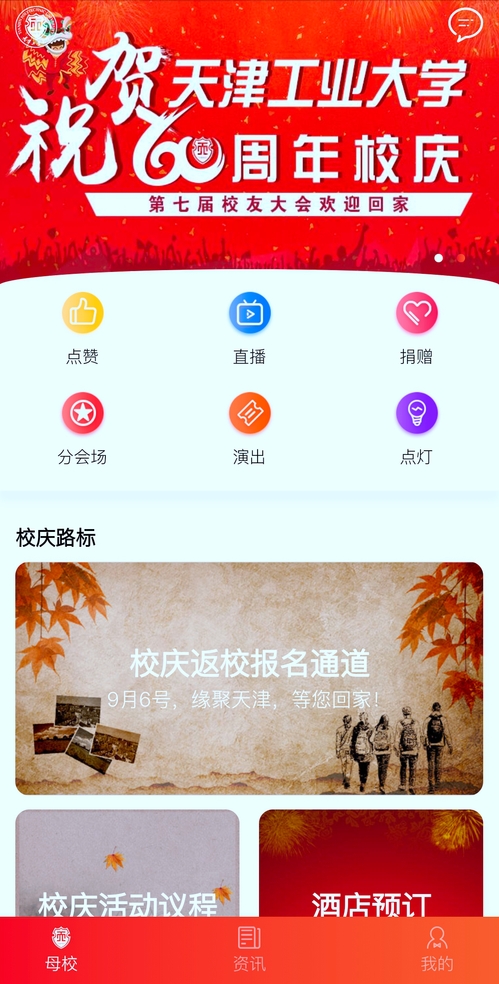 随后,校友刘鹏飞揭晓了天工大60年校庆特别版APP,并对其功能进行介绍。该款APP的首页囊括了点赞、捐赠、直播、分会场、演出、点灯六大功能板块,首页中还开通校庆返校报名、校庆活动议程查看、酒店预订三大通道,为校友们返校参加活动提供便利。天津校友会企业家分会秘书长、我校77级校友吕增仁隆重宣布天工大60年特别版APP正式上线。