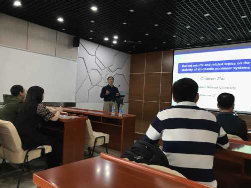 学术报告会开始,朱全新教授重点讲解了一些随机系统稳定性的经典概念,并介绍了一些现有的关于随机系统稳定性的结果。随后,朱教授进一步介绍了自己在随机系统稳定性方面取得的一些重要研究成果。朱教授还结合自己的经历为师生介绍了在指导研究生以及科研方面的宝贵经验。朱教授的研究思路和研究方法使师生们受益匪浅。