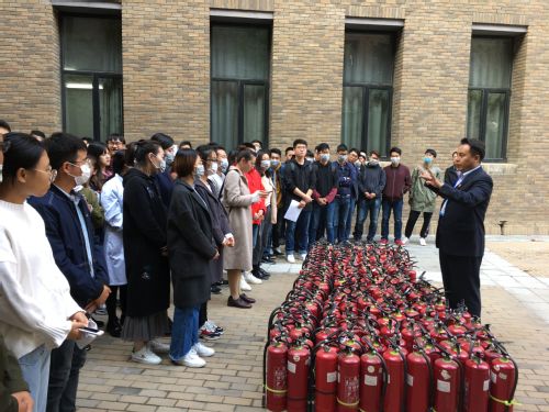 为保障演习顺利进行,演练前夕,学院给参演师生发布了演习预案,并对演练现场提前做好清障工作。下午2:00,安居防火培训中心周邹老师对近期发生的典型火灾案例进行了分析,就如何树立正确的消防意识、个人面对突发火灾事故应如何进行救灾及逃生等方面内容,向与会师生进行了培训。下午2:40,消防疏散演练正式开始。校保卫处张志勇处长亲临现场指挥,当消防警报拉响后,学院楼内的95名教师、350名研究生按疏散路线成功撤离到学院楼后空地的指定位置,整个过程迅速、有序。随后,校保卫处的张晓峰老师向师生讲解了灭火器的使用原理、基本操作方法及注意事项。认真聆听及观摩操作后,与会师生均亲自体验了现场灭火的全过程,按照灭火的步骤和方法将火堆燃起的大火迅速扑灭。