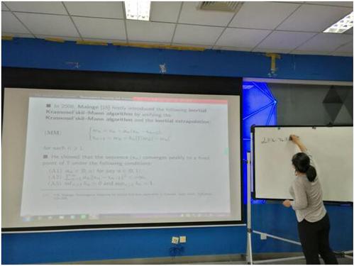 报告会上,董教授系统而详细地介绍了非扩张算子的多步惯Krasnosel'skii- Mann算法,给出了算法惯性参数的选择以及算法的收敛分析,并构造了数值算例来演示算法的收敛性。同学们纷纷表示从董教授的演讲中收获很多,也对非扩张算子有了更加清晰的认识。有几位同学向董教授请教问题,董教授都给了详细的解答。