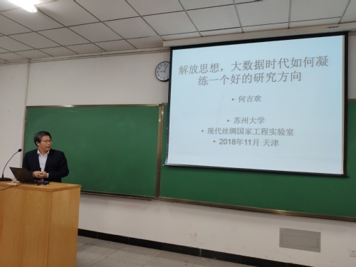 为了提高2019年度国家自然科学基金项目的申报质量,增加立项命中率, 2018年11月8日上午,由纺织学院举办的我校首场国家自然科学基金申报培训会正式举行。苏州大学何吉欢教授应邀作了题为“解放思想,大数据时代如何凝练一个好的研究方向”的培训报告。我校纺织学院、数学科学学院、物理科学与技术学院、材料科学与工程学院、环境科学与工程学院、化学与化工学院等学院相关研究方向的师生近200人参加了本次报告会。报告会由纺织学院副院长刘雍教授主持。