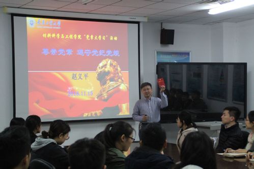 11月15日,材料学院党委书记赵义平以《尊崇党章,遵守党纪党规》为题,为全体学生党员讲授了第一节党课,拉开了学院“党章大学习”系列党课活动的序幕。赵书记以回归党章学习为本,引领同学们详细回顾了历届党章的主要内容,强调了学习党章的重要性,也解答了大家的一些困惑。随后,学院教学副院长张桂芳围绕全国教育大会的精神,以《教育兴,则国家兴》为题为全体教师党员讲授党课。张副院长与老师们共同探讨了新时代教育面临的形式以及全面振兴本科教育的新思路。学院党委委员陈虹密切围绕教育思想大讨论以及学风问题为全体学生党员讲授了党课。