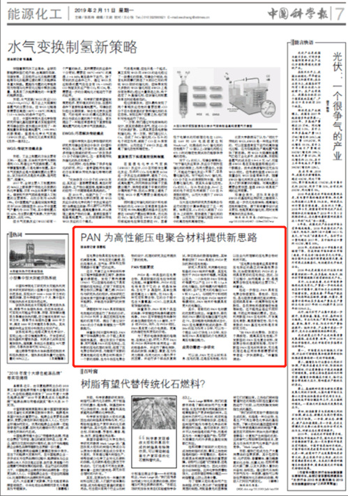 2019年02月11日,《中国科学报》第七版 以《PAN为高性能压电聚合材料提供新思路》为题对我校做了报道,现将全文转发如下,以飨读者。