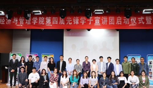 为引领优良学风,激发广大学生的学习热情,2019年5月8日晚上,经济与管理学院第四届先锋学子宣讲团启动仪式暨首场学风宣讲会在学院B座141报告厅举行。活动通过选树优秀学生典型,讲好身边追梦人的求索奋斗历程,引导经管学子以身边优秀学生为榜样,点燃奋斗青春的热情。活动邀请校党委学工部副部长朱士凤、学生管理资助中心王威参加,经济与管理学院党委副书记李贺、学生工作办公室副主任刘鑫、各专业辅导员以及学生代表200余人共同聆听宣讲。