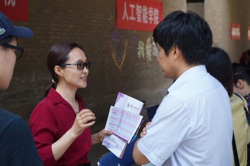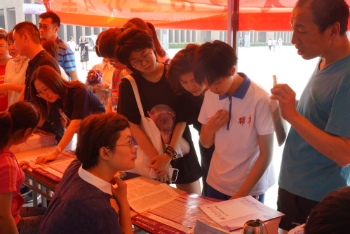 咨询会现场除了络绎不绝的家长、考生和耐心解答的招生咨询老师们,还有我校忙碌的志愿者们。他们在现场负责引导家长,提供饮用水,维持咨询会现场秩序。面对家长的询问,志愿者们都一一解答,并向考生和家长介绍校园文化、学校特色等。