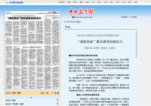 2019年9月8日,《中国教育报》要闻版以《天津工业大学推进全员全过程全方位教育教学改革——“课程思政”激发课堂创新活力》为题对我校进行了报道,现将全文转发如下,以飨读者。