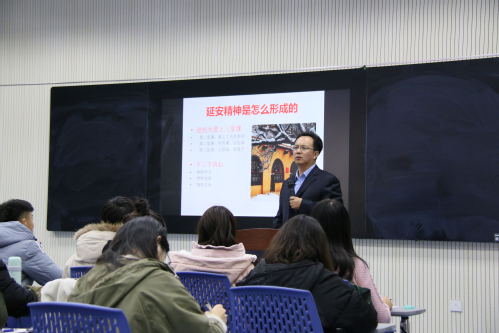 刘建华教授以“斯诺之困——东方魔力之谜”导入主题,围绕什么是延安精神、延安精神是怎样形成的、延安精神的主要内容有哪些、新时代延安精神再思考四个方面展开讲解,运用丰富的照片和事例认真梳理了中共中央在延安十三年艰辛而辉煌的历史,重现了以毛泽东同志为代表的共产党人和老一辈无产阶级革命家在延安的真实写照,揭示了中国共产党能够带领中国革命走向胜利的原因,深刻地阐述了延安精神的深刻内涵。他勉励在场的同学们要结合当今的时代背景,要继续发扬密切联系群众、艰苦奋斗和实事求是的延安精神,勇敢去争取胜利,向青年时期的习近平总书记学习,努力增长才干,提高为人民服务的本领,让延安精神投射出新的时代光芒。