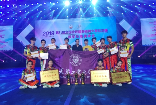 天津市天津工业大学教育发展基金会全额资助我校健美操队参加本次大赛,学校共派出12名运动员参加了大学甲组(体育院校及高水平运动队高校)3个项目的比赛,最终获得有氧舞蹈第一名、民族健身操第一名、健身操舞第一名,3个项目均获得特等奖。同时,我校健美操队还获得本次大赛“最佳完成奖”,周校锋老师被授予健身操舞全国“优秀教练员”荣誉称号。