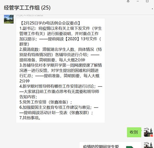各辅导员分别介绍了所负责学生中滞留湖北人员情况,并对目前学生反映线上教学存在的困难和问题进行汇总。参会人员还对春季学期各项学生管理准备工作展开了讨论与交流。