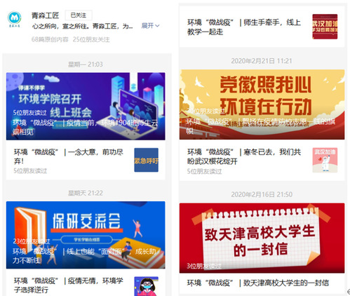 信息畅通、宣传到位。自疫情发生以来,环境学院持续关注在职教师、退休教师以及学生的健康状态,疫情监控组严格执行“日报告、零报告”制度,并且对留学生和国外进修的教师进行温馨提醒和人文关怀。宣传和舆情监控组及时发布信息,通过学院官网、“青淼工匠”微信公众号、LED电子显示屏播送信息,弘扬正能量,广泛宣传普及疫情防控知识,筑牢群防群治的严密防线。“青淼工匠”公众号推出了“微战役”系列报道,增强师生战胜疫情的信心。