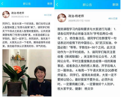 我校“停课不停学,网上开课”第一周,民族预科班的形势与政策课就开始了,任课教师是杨文华老师。为了上好线上思想政治理论课,杨老师认真学习网络技术,学习教学平台操作方法,很快就摸索、总结出了一些经验,比如在群公告中发通告的时候,为了便于学生分辨,给文件命名的时候都会加入当天的日期。她建立了班级学习QQ群,邀请学习委员作群管理员,让同学们自己管理自己。现在,杨老师俨然已经成了线上教学达人。