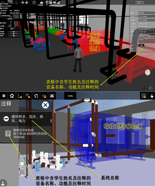 每位同学在自己的电脑或手机上,借助这样一个基于真实空间的仿真虚拟空间,不仅可以全程参观设备站内的整个供热制冷系统,还可以以任意视角观察机房内部的每一台设备及管道连接情况,使学生足不出户就可进入虚拟的(而现实中不能随意参观、闲人免进的)供热制冷设备站内漫游参观,而漫游环境就如同在游戏环境中一样,漫游人物可以前进后退,可以跑跳,这极大地提高了学生的学习兴趣和热情。除了沉浸感,该虚拟漫游系统还可以实现简单的交互性,即在漫游的过程中对每一台设备的名称、功能及工作原理等进行注释并保存。实习指导教师可通过每位同学提交的注释文件,有效甄别学生是否独立完成及是否掌握相关知识点。
