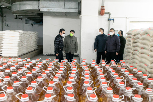 在食堂物资储备库,校领导查看了米面粮油和各种调味用品等物资储备情况,对后勤管理处的准备和应对工作给予了肯定,强调食堂的建设事关全体师生的安全,一定要科学合理地做好物资储备和食品安全等工作,为全校师生筑起坚强的食品安全屏障。