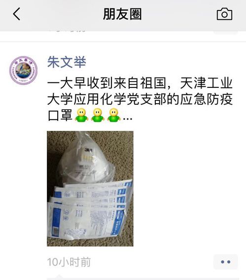 “一大早收到来自祖国、来自天津工业大学应用化学党支部的应急防疫口罩……”这是化学与化工学院在美国加州访学的朱文举老师微信朋友圈的最新状态,在这两句话后还有三个拥抱表情。经了解,原来是学院应用化学系党支部书记郑春明老师为朱老师寄去了防疫口罩。