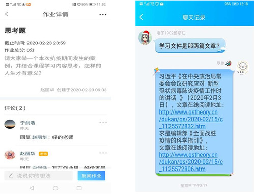 马克思主义学院教师不仅积极学习习近平总书记关于打赢疫情阻击战的相关重要讲话,学习党中央关于分析新冠肺炎疫情防控形势、研究部署统筹推进疫情防控和经济社会发展工作会议精神,还积极收集“抗疫”以来全社会涌现出来的诸多典型人物和典型事迹,实时将其融入教学之中,用好“抗疫”社会大教材。《马克思主义基本原理概论》课黄燕老师在第一周利用直播课堂,从“习近平的抗疫时间”到奋战在抗击疫情一线的院士、医生,再到后方捐资捐物的普通单位和个人,将一个个生动鲜活的案例,融入到原理课绪论关于“马克思主义人民性”的内容,理论联系实际,使学生们真切感受到了马克思主义理论与新时代中国特色社会主义现代化建设之间的紧密联系。《思想道德修养与法律基础》课赵丽华老师,结合当下“抗疫”的形势,考虑到学生们从网络、生活中已经了解了很多鲜活的英雄人物和英雄事迹,经历了各种情绪体验和思想感悟,布置了“请大家举一个抗疫期间发生的案例,并结合课程内容思考,怎样的人生有意义?”的问题,引导学生们展开讨论,调动了学生们的参与积极性,师生之间引发强烈共鸣。学生们普遍反映,要以抗疫“时代英雄”为榜样,将“小我融入大我”,时刻准备,为国家贡献自己的力量。《中国近现代史纲要》课教研室及时将《求实》杂志发表的习近平总书记的重要文章作为阅读材料发给学生,请学生们一起学习,书写学习感想。《毛泽东思想和中国特色社会主义理论体系概论》课教研室顾洪英和邓鹏老师撰写相关的理论文章,积极在《光明网》、《中国共产党新闻网》发声,用中国特色社会主义理论体系的理论逻辑阐释了“抗疫”、“防疫”行动中的“中国智慧”。