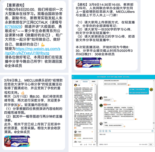 从寒假开始,孙老师团队像往年一样,借助网络开设MECLUB大学生实践俱乐部冬令营项目,通过云班课平台发布学科竞赛相关专业学习资源。疫情发生之后,学生们无法返校,孙老师团队将冬令营转为“战‘疫’特训营”,每周一到二次,通过在线轻直播开展云课堂教学,不仅继续专业学习,还分享生命感悟,加强思政教育,提升学生在线学习能力和综合软实力。