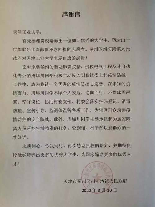 这次来势汹汹的疫情,让他看到了中国人民空前团结配合,看到了中国能够“集中力量办大事”的制度优越性,更看到了党的正确领导。他说:“这次疫情我看到了什么叫‘众志成城’,我想说:我生在中国,长在中国,我很自豪!”他无私的行为感动了周围的每一个人,天津市蓟州区州河湾镇人民政府给他写了一封感谢信,感谢他为此次疫情、为蓟州区河湾镇做出的无私奉献。他说:“我只想实实在在为家乡做点事。感谢政府对我工作的肯定,这也是我继续前行的动力。”