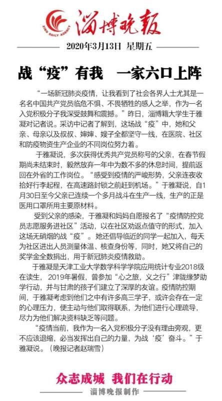 3月13日,《淄博晚报》以《战“疫”有我,一家六口上阵》为题对数学科学学院统计1802班于雅凝同学和家人一起战“疫”的事迹作了报道,现将原文转发如下。