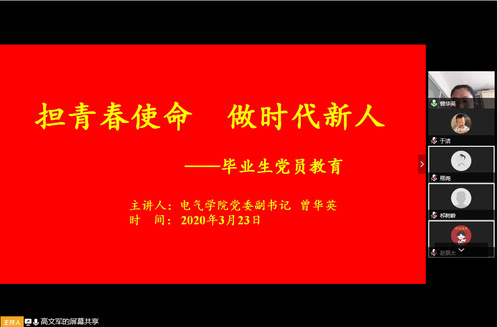 “要将自己的小我融入到祖国的大我,走出孤芳自赏的小我,像一面旗帜一样,带动广大青年不惧风雨,勇挑重担。”曾华英副书记在为毕业生党员讲授最后一堂党课中这样说道。围绕“担青春使命,做时代新人”的主题,曾书记从全民抗疫战争说起,肯定了电气学子在抗疫斗争中做出的青春贡献,强调中华民族第二个百年奋斗目标,即建成社会主义现代化强国,是90后他们这代青年必须和必将承担的历史重任,研究生是社会主义现代化建设的高层次人员,党员更是这个群体中的优秀代表,党和国家、人民对他们寄予期望。希望他们站好毕业前的最后一班岗,继续为打赢这场抗疫战争贡献力量;牢记党员身份,坚定理想信念,在追求真理中,永葆党员本色;脚踏实地,不畏艰难险阻,在探索实践中砥砺品行,让青春在党和人民最需要的地方绽放绚丽之花。随后,研究生第一党支部书记赵佳佳和研究生第三党支部书记于洁老师分别对毕业生党员进行殷切寄语——“支部书记有话说”,他们激励毕业生党员要继续保持对党的热情和敬意,启迪毕业生党员要胸怀理想和信念,牢记党员义务和责任。同时,他们为毕业生党员在线送上了政治生日卡,叮嘱他们要牢记党的宗旨,认真履行党员义务,悟初心、守初心、践初心,做时代先锋,为党旗添彩,为全面建成小康社会,做出更大的贡献。最后,组织员高文军有针对性地给毕业生党员们开展了相关培训,强调了党组织关系接转的重要性,并为每位毕业生党员发放了《致2020届毕业生党员的一封信》,强调了党员组织关系接转注意事项。