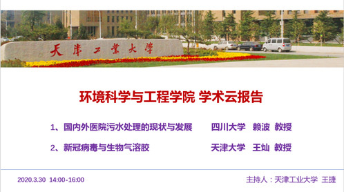 为了进一步深入贯彻落实新冠肺炎疫情期间关于“停课不停学”工作安排,继续保持师生居家抗疫期间的学术交流热情。3月30日下午,环境科学与工程学院通过网络进行了一次“云端”学术交流活动。学院邀请四川大学环境科学与工程学院赖波教授、天津大学环境科学与工程学院王灿教授为广大师生进行了主题为“污水中病毒的安全处置与处理”的学术报告,与师生交流有关水中有毒病菌去除的先进的技术和方法。本次学术交流活动由王捷副院长主持。