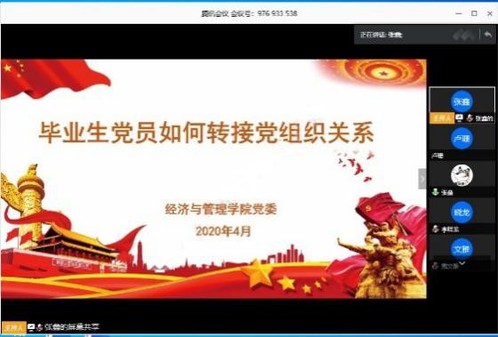 4月7日上午,经管学院党委通过线上形式开展了“牢记党员身份 绽放青春绚丽之花”研究生毕业生党员主题教育活动。学院党委书记王军杰为2020届研究生毕业生党员讲授“砥砺坚强党性,做到‘两个维护’”的专题党课。学院全体辅导员以及全体研究生毕业生党员共计80余人参加此次主题活动。