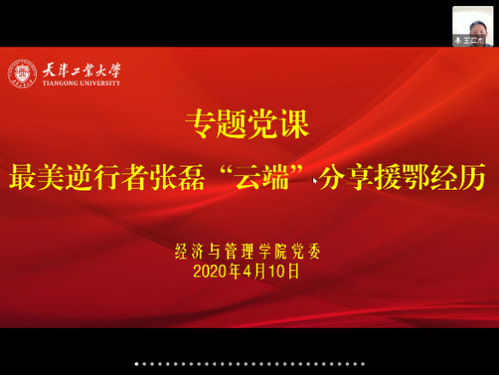 4月10日下午,经济与管理学院党委组织开展了一场鲜活的党课:天津市第十二批医疗救治队队长、天津中医药大学第四附属医院执行院长张磊在线上给学院教师和部分学生党员讲述在援鄂一线抗击新冠肺炎的经历和深切感悟。