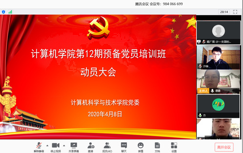 为进一步加强大学生入党后的培养教育,提高预备党员的理论水平和党性修养,充分发挥党员先锋模范作用,计算机科学与技术学院党委于4月8日组织召开了参加学校第12期预备党员党校培训班学员视频动员会,学院党委副书记方桂珍,学办主任田旭、辅导员沙瑞和参加培训的预备党员共42人参会。会议由组织员谭勇主持。