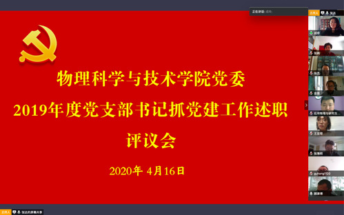 为深入学习贯彻习近平新时代中国特色社会主义思想,落实党的十九大和十九届四中全会精神,坚持党要管党、全面从严治党,坚持和完善党支部书记抓党建述职评议考核制度,根据学校要求,2020年4月16日下午,物理科学与技术学院党委召开2019年度党支部书记抓党建工作述职评议会。