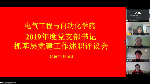 4月16日下午,电气工程与自动化学院党委召开2019年度党支部书记抓基层党建工作述职评议会,会议以网络视频形式召开。学院党政领导班子、全体党支部书记、组织员,各师生党支部党员、群众代表,共计37人参加了此次会议,会议由学院党委书记李红霞主持。学校党委组织部李皎老师全程列席督导。