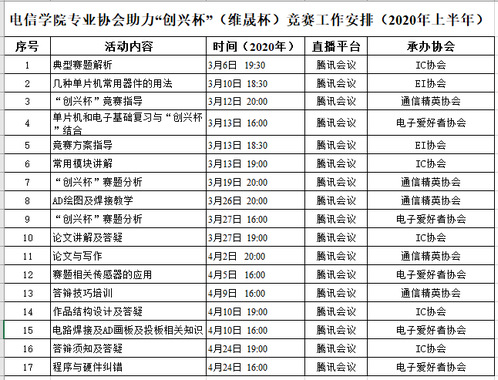 为培养专业兴趣,强化专业认同,提高人才培养质量,电子与信息工程学院党委依托网络平台,有条不紊推进学院第十五届“创兴杯”(维晟杯)实践能力竞赛(以下简称“创兴杯”)的相关工作。在备赛的黄金时期,各专业协会紧密结合参赛同学的实际需求,制定了《专业协会助推“创兴杯”计划》,安排了17场线上“创兴杯”辅导课程。