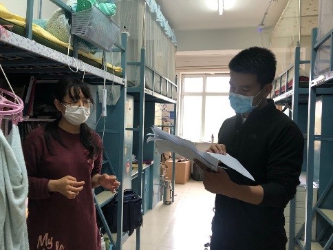 同时,在学生公寓测温值班的教师突击队员们也在坚守岗位,测体温、做好信息登记、送学生返回到宿舍楼,叮嘱好学生一定做好个人防护。8日下午,学院领导带领辅导员一行前往返校学生宿舍,慰问学生返校旅途情况,嘱咐大家做好体温报备、宿舍消毒,教育落实学校和学院制定的规章制度,也对学生的毕业打算和就业考学情况进行了沟通了解。