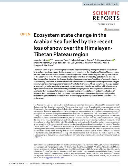 近日,我校经济与管理学院教师田洪阵博士与美国哥伦比亚大学教授Joaquim I. Goes博士等合作的研究成果《Ecosystem state change in the Arabian Sea fuelled by the recent loss of snow over the Himalayan-Tibetan Plateau region》在Nature旗下期刊《Scientific Reports》上发表,这标志着我校在海洋遥感研究方面取得积极进展。
