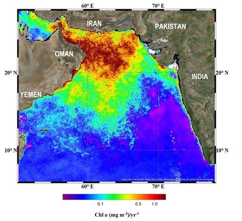 1996-2018年阿拉伯海冬季叶绿素a浓度(反映浮游植物生物量)空间变化趋势(来源:《Scientific Reports》)