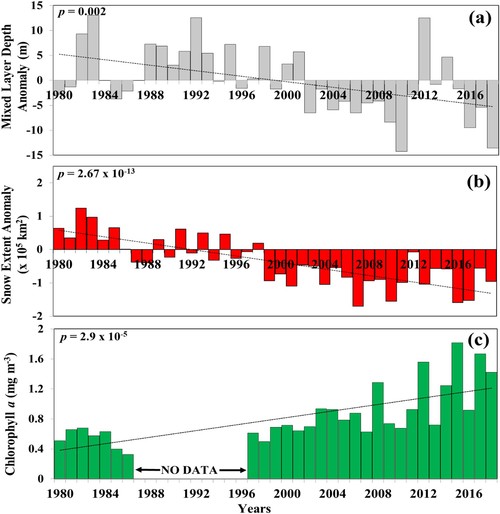 1980-2018年混合层厚度、积雪面积和叶绿素a浓度变化(来源:《Scientific Reports》)