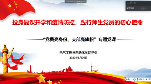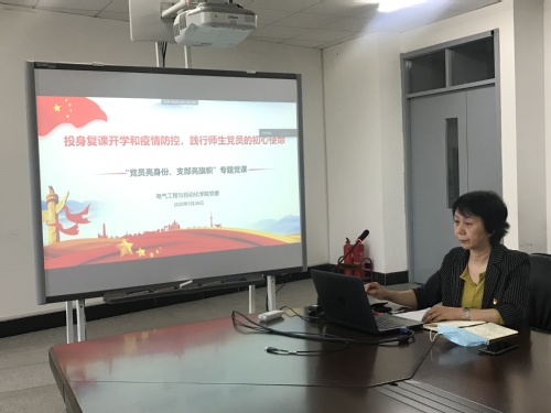 为更好弘扬“抗疫精神”,加强党员理想信念教育,提升凝聚力和战斗力,强化政治素质、理论水平和党性修养,按照校党委《关于在复课开学疫情防控工作中开展“党员亮身份、支部亮旗帜”活动的通知》要求,2020年5月26日,电气工程与自动化学院党委书记李红霞以《投身复课开学和疫情防控,践行师生党员的初心使命》为主题,为全院近300名学生党员、发展对象和入党积极分子讲授了一堂寓意深刻的专题党课。党课通过线下和线上结合的方式开展,组织员和全体学生支部书记也参加了此次专题党课。学院党委副书记曾华英主持会议。