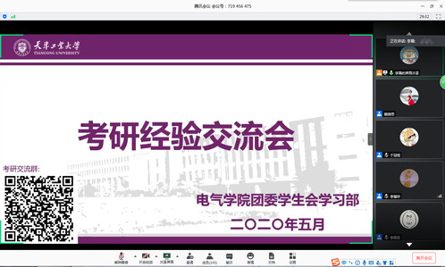 为增强2021届学生对当前考研形势的了解,帮助同学们端正考研态度,打好坚实基础,确立合理的考研奋斗目标,2020年5月27日,电气工程与自动化学院举办线上考研经验交流会。学院学生工作办公室蔡施思老师、2020届成功考取硕士研究生的七位优秀学子及2021届考研学生参加了此次会议。