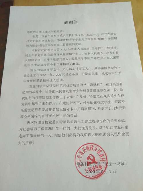 近日,环境科学与工程学院收到了一封来自山西省平遥县南政乡道备村的感谢信,信中对环境学院青年学生党员雷蕊同志在2020年寒假期间为道备村防控新冠肺炎疫情工作给予了高度评价,表示了诚挚的感谢。