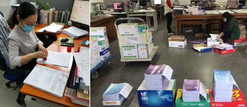 由于毕业生离校前需清还图书、注销权限、论文签名盖章等工作,手续相对繁杂,图书馆各部门通力合作,技术部现场调试设备,并对各学院的毕业生名单、未还书人员名单进行收集、甄别,提早报送数据;流通部分别在办事大厅和图书馆内为毕业生办理还书、离校手续;信息部提前将论文检索证明、期刊登记证明统一打印盖章后返回学院,避免了学生聚集,节省了同学们的办理时间;办公室加班加点,在开学前两个星期完成了三千余本论文的打印装订,保证学生毕业论文按时入档。