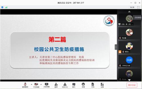 本次防疫知识讲座通过腾讯会议开展,主要包括介绍新型冠状病毒感染肺炎的相关知识、普及校园公共卫生防疫措施和师生疑似感染症状的应急处理三个篇章。首先由肖丹丹医生对新冠肺炎从流行病学和临床特点进行讲解,介绍了对冠状病毒最有效的消毒灭活方式依次为:紫外线、高温、75%乙醇和含氯消毒剂等。其次,由龙莉医生普及了关于回校途中和复学期间的防控措施。其中龙医生建议学生选择合适的交通工具返校,注意减少人员接触与聚集,并科普了工业与医用型N95口罩的区别。龙医生建议同学们外出时选择合适的口罩型号即可,并提醒广大师生注意日常勤洗手保持个人和室内卫生。最后,肖医生介绍对校园公共场所出现应急情况的处理流程,强调师生必须做好每日体温监测,宿舍、教室和办公区等场所做好消毒。同学们在线上积极参与互动,认真聆听防疫知识讲座,学习到相应防疫措施并感谢两位医生的热情讲解,表示会积极配合学校的防疫安排工作。