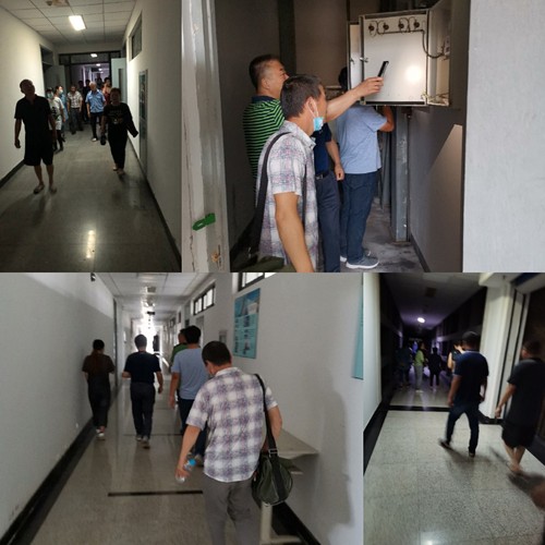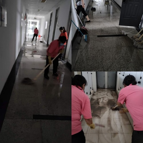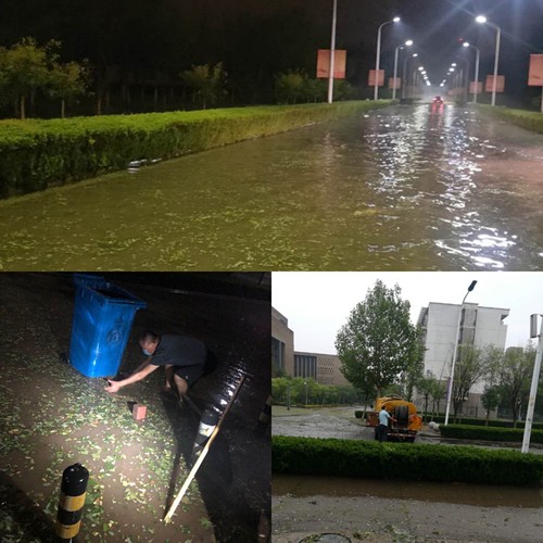 面对突发情况,后勤管理处迅速行动,紧急启动应急预案,联合各物业公司调度人员投入到紧张的抗汛工作中。后勤值班人员、各物业公司经理第一时间到达现场,连夜开展校园清整、楼宇安全隐患排查工作。物业员工冒着雨、顶着风、蹚着水在校园内分批分片打开各个下水口,清掏落叶,确保积水流通。直到凌晨4点,校园内的积水才基本排走。经过短暂的休息修整后,早上7点又开始对校园内倒地的枯树、败枝、路面上积存的大面积落叶进行切割、清扫、清运,校园内各主干道路恢复通行。同时,为确保各楼宇安全,后勤采取拉网式安全排查。排查过程中,及时处理漏雨点、清扫楼内积水。对漏雨比较严重的物理学院,采取整栋楼断电保护措施,迅速清理楼道、电井内积水。联系能源电力保障人员对各楼宇的变电室、配电间进行隐患排查,防止意外事故发生,确保用电安全。
